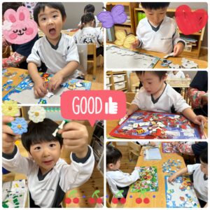 パズルが完成すると、「できたよー!」と嬉しそうに先生やお友達に報告している姿も見られました♡