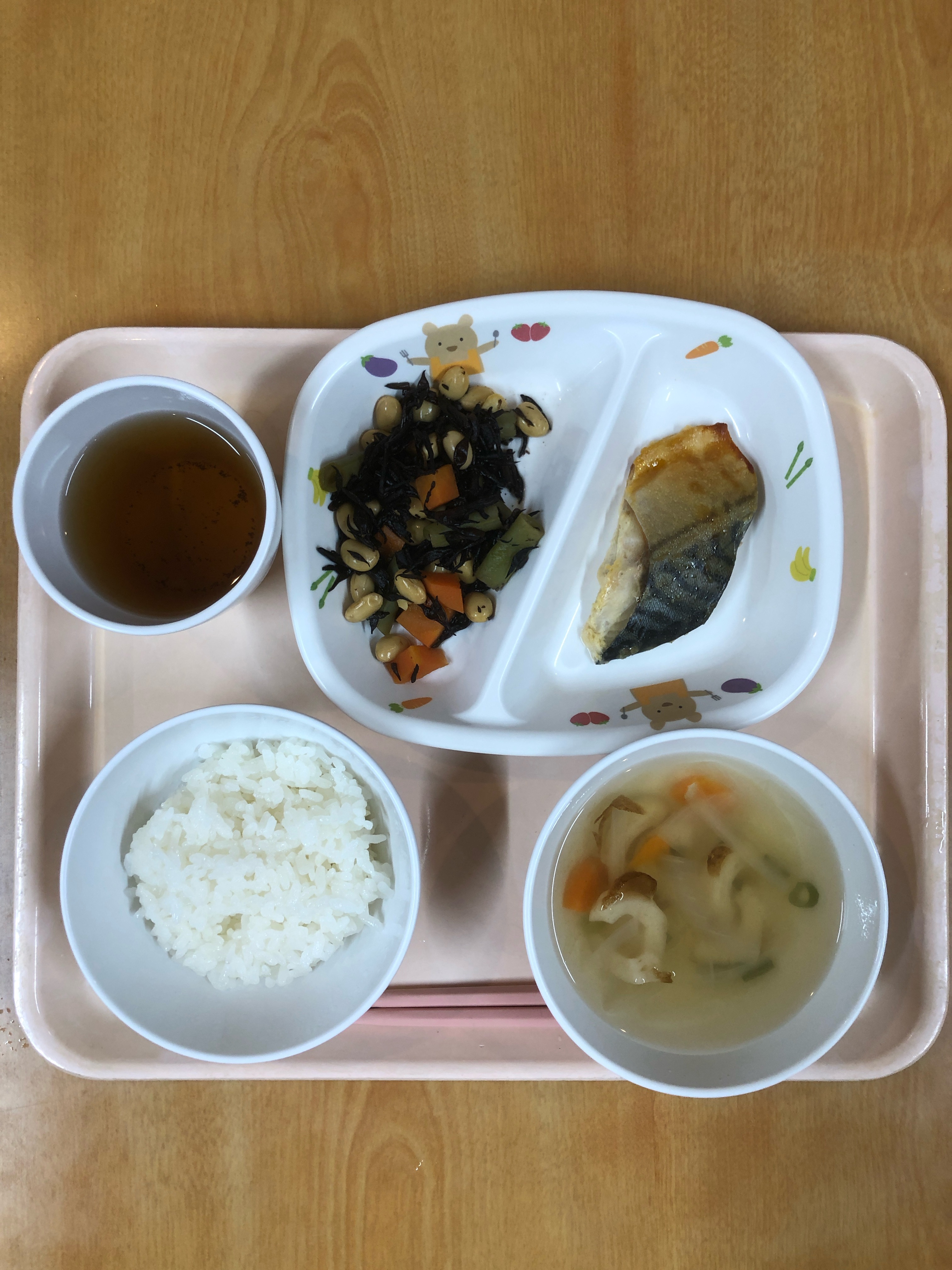 ご飯 サバの味噌マヨ焼き 大豆とひじきの煮物 竹輪のすまし汁