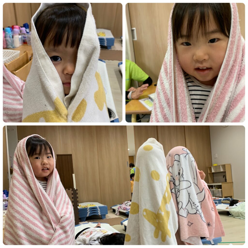 ご飯を食べた後はぐっすりでしたが、少しだけ早起きしてタオルオバケになって寝ている