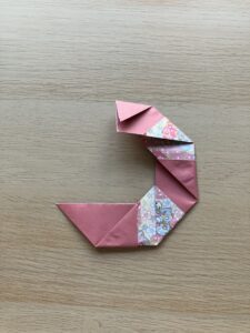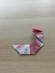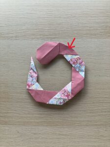 ⑮ 赤い矢印の部分を折って、ヘビの体を丸くしましょう