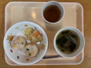 鮭のコーンマヨおにぎり ツナポテト ほうれん草のコンソメスープ