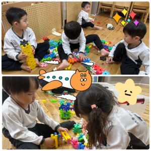 「こんなものが出来たよー!」と互いに見せ合ったり、「これ貸して!」「いいよー!」ととっても仲良しな子ども達でした♡