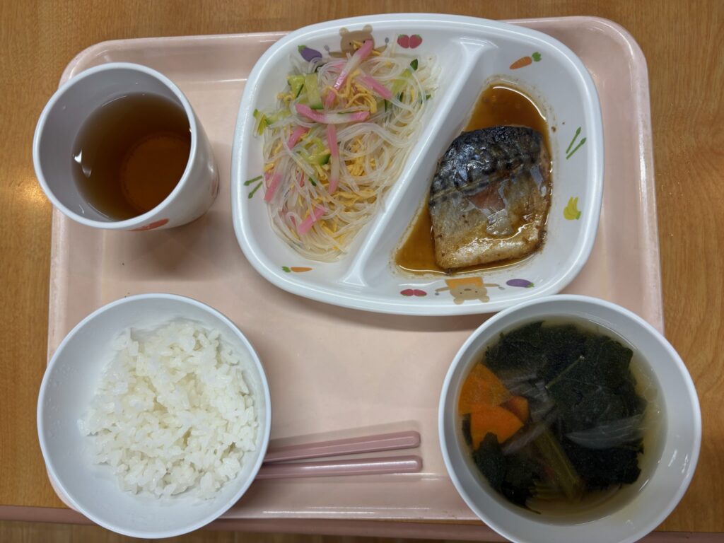 ご飯 サバのウスターソース煮 春雨サラダ 玉ねぎのスープ