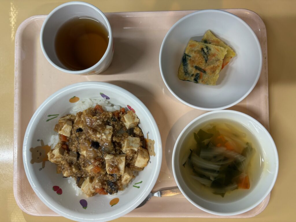 ご飯、マーボー豆腐、海鮮チヂミ、わかめスープ