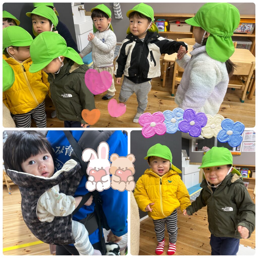 帽子をかぶって上着を着て、お友達と手を繋いで準備ばっちり✌小さいお友達は先生におんぶをしてもらいます。