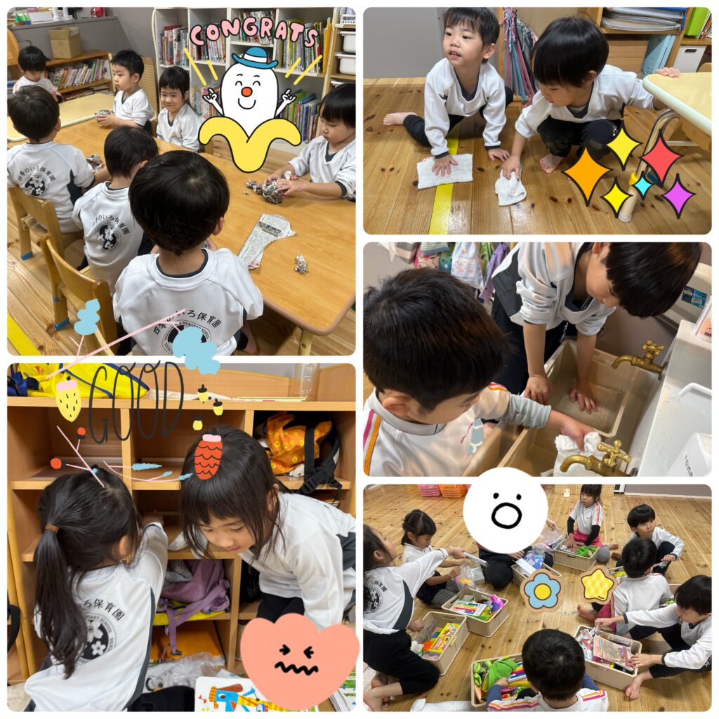 そのあとは今日で今年の登園が終わるお友達もいるので、たくさん遊んだ室内の床のふき掃除と持ち物の整理整頓をしました。