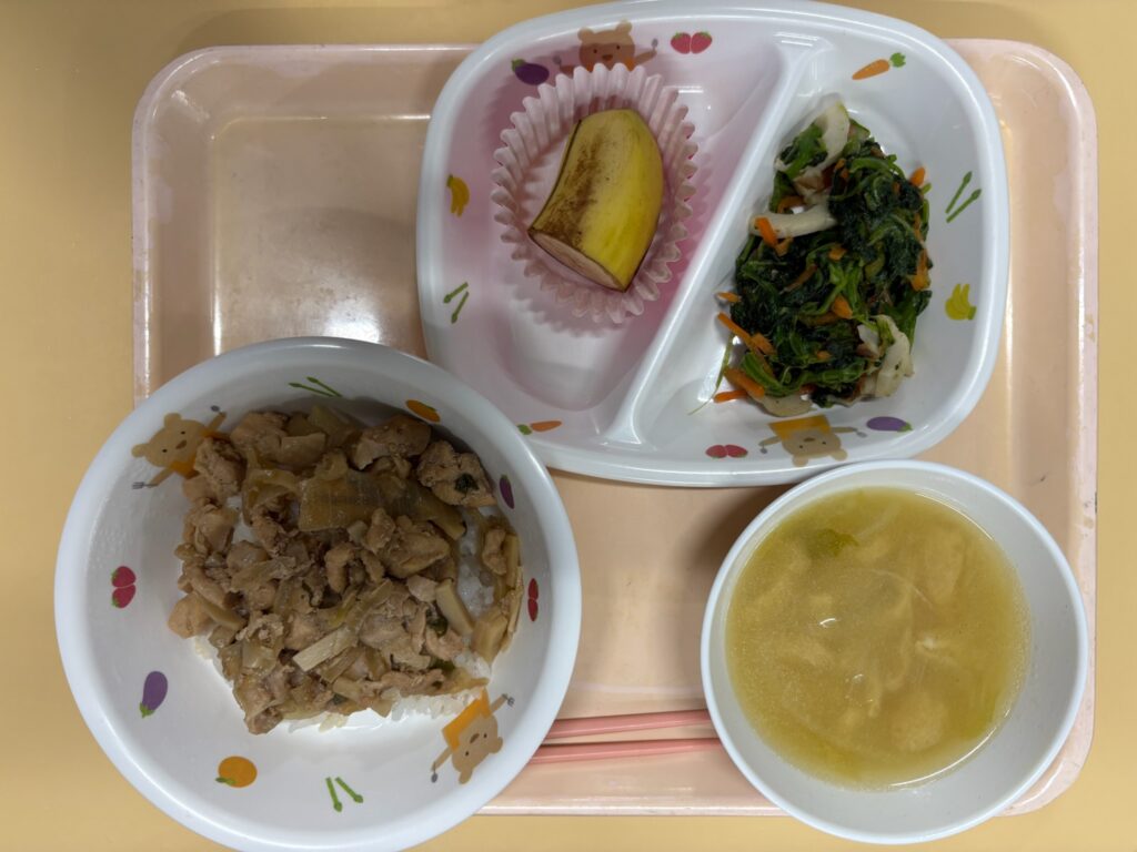 鶏照り丼 ほうれん草のおかか和え 白菜の味噌汁 バナナ