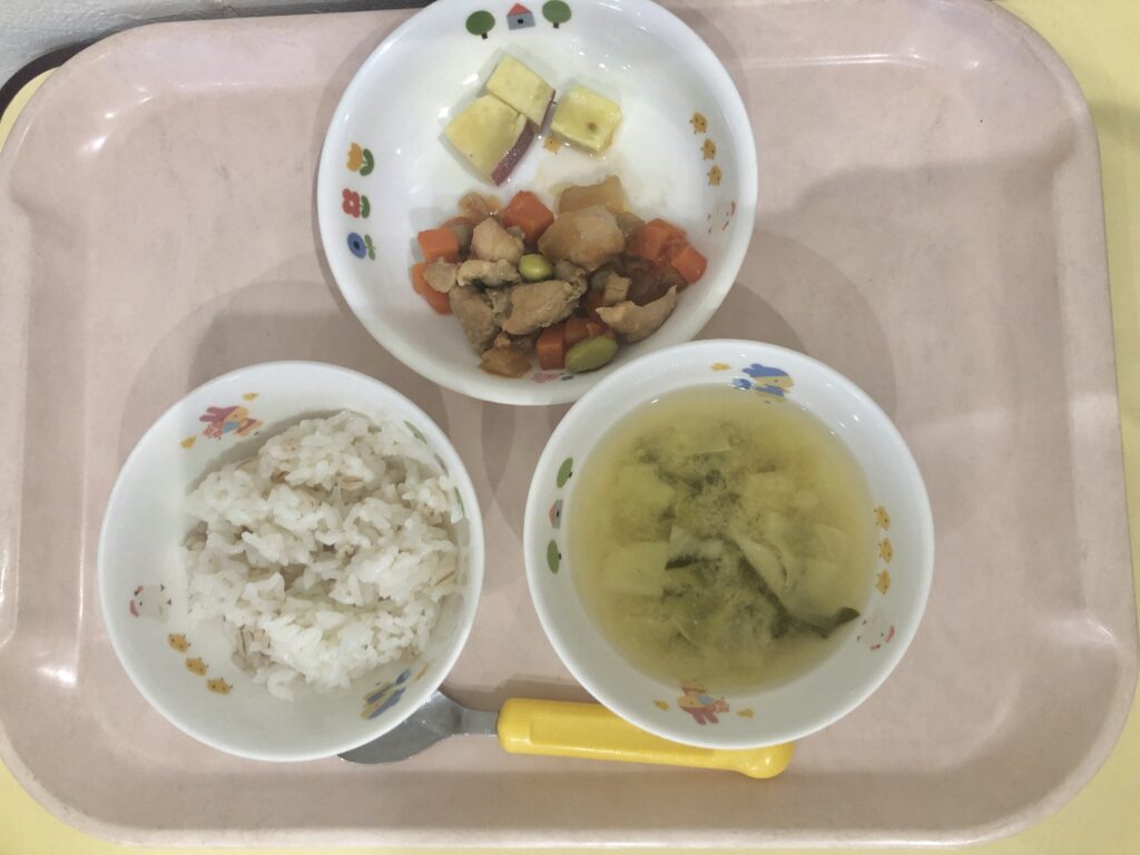 麦ごはん、みそ汁、鶏肉の治部煮風、さつまいものレモン煮