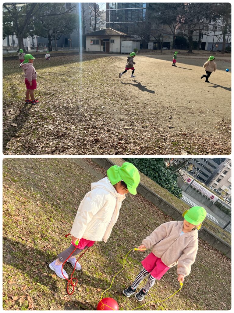 風が冷たくても、全く関係なし!の子どもたち🤭ボールや縄跳びで、思う存分身体を動かして遊びましたよ✨