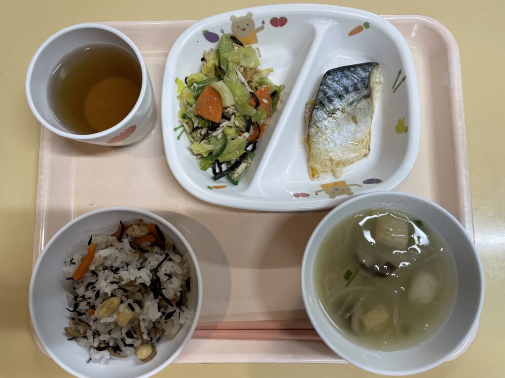大豆入混ぜご飯 サバの塩焼き キャベツの塩昆布和え 麩と玉葱の味噌汁