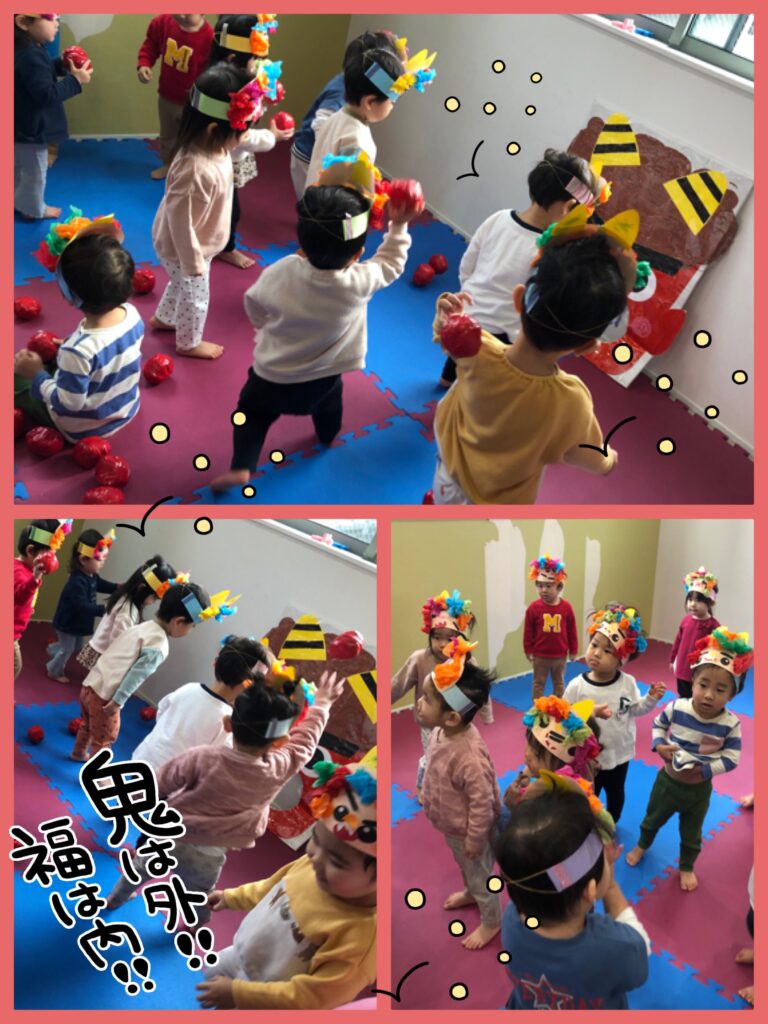 小さいおともだちは、手作りのお面をつけて、鬼の的にむかって豆まきをしました✨