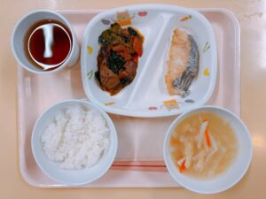ご飯、ホキのみりん焼き、レバーの甘辛炒め、大根の味噌汁