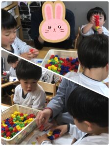 うさぎぐみ、ぱんだぐみ、ぞうぐみさんはプログラミング教室がありました。今日のレッスンはプログラミングブロックを使って、色や形を見て、創造してグロックを組み立てました。