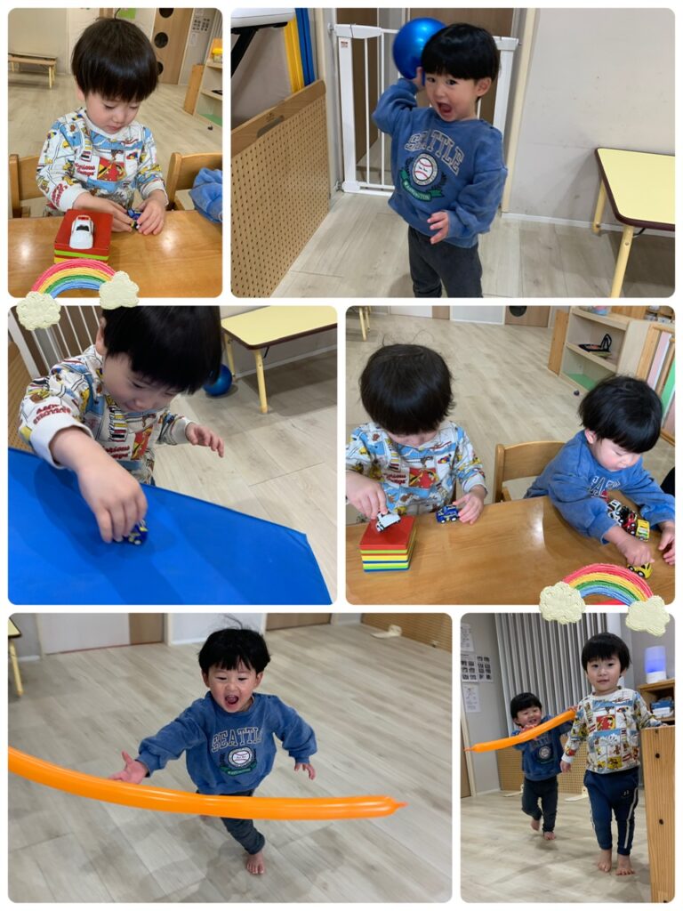 お部屋の中で車や電車、長い風船やボールなど色々な事をして楽しく過ごしました☺️お部屋の中を先生たちやお友達と一緒に元気良く駆け回り、体もたくさん動かしました★彡
