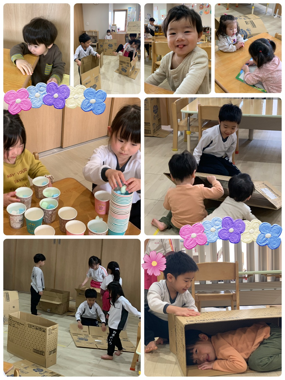 今日は12名のお友達が元気いっぱい登園してきてくれました!!みんなでダンボールで遊んだり、紙コップで遊んだりして色々な事をして今日も楽しく遊びました♡