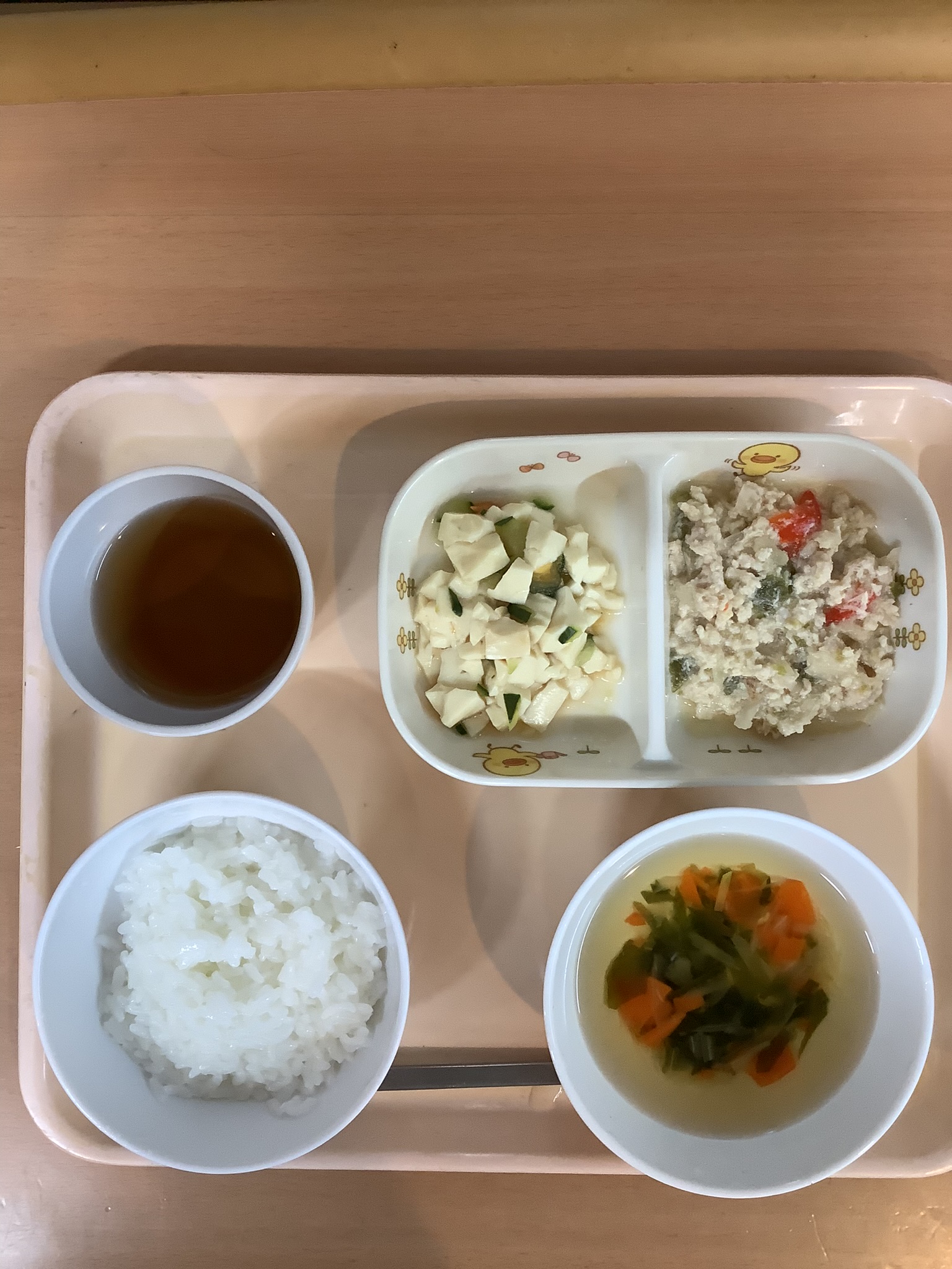 ご飯、鶏ひき肉と野菜の煮物、トマトと豆腐の和え物、わかめスープ