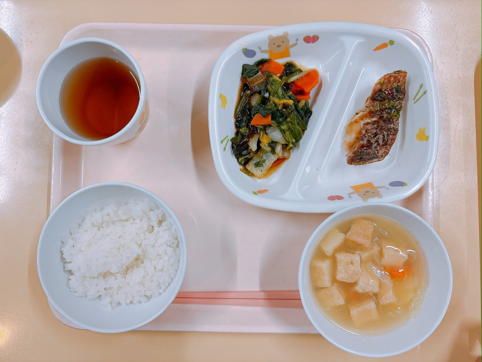 ご飯、赤魚のお好み焼き風、白菜のシソ昆布和え、厚揚げ豆腐の味噌汁