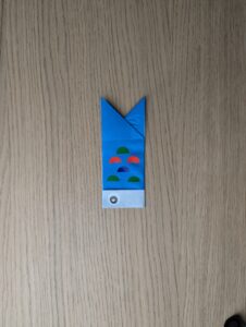 12・シールに目玉を描きうろこに見えるように切ったシールを貼り付けて出来上がり