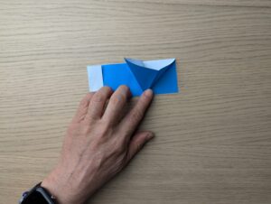 8・そのまま三角の左側を右に倒して三角を内側に折り込みます