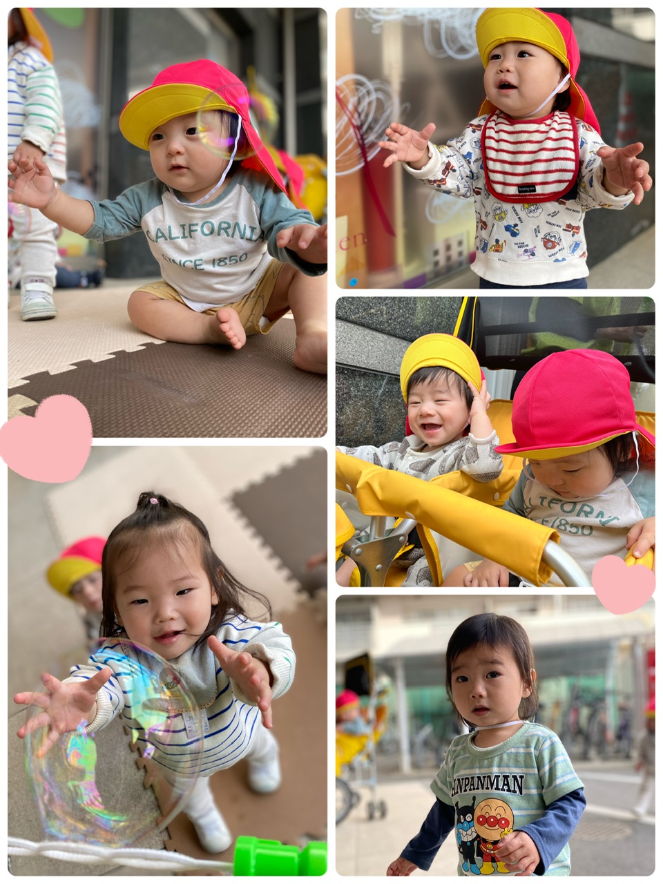 おひさま組さんは園の前でシャボン玉、ほし組さんは公園へお散歩に行きました!!ポカポカ暖かい気候の中で、ボールやシャボン玉で遊び子どもたちも大喜びでした♡笑顔が素敵です☺️