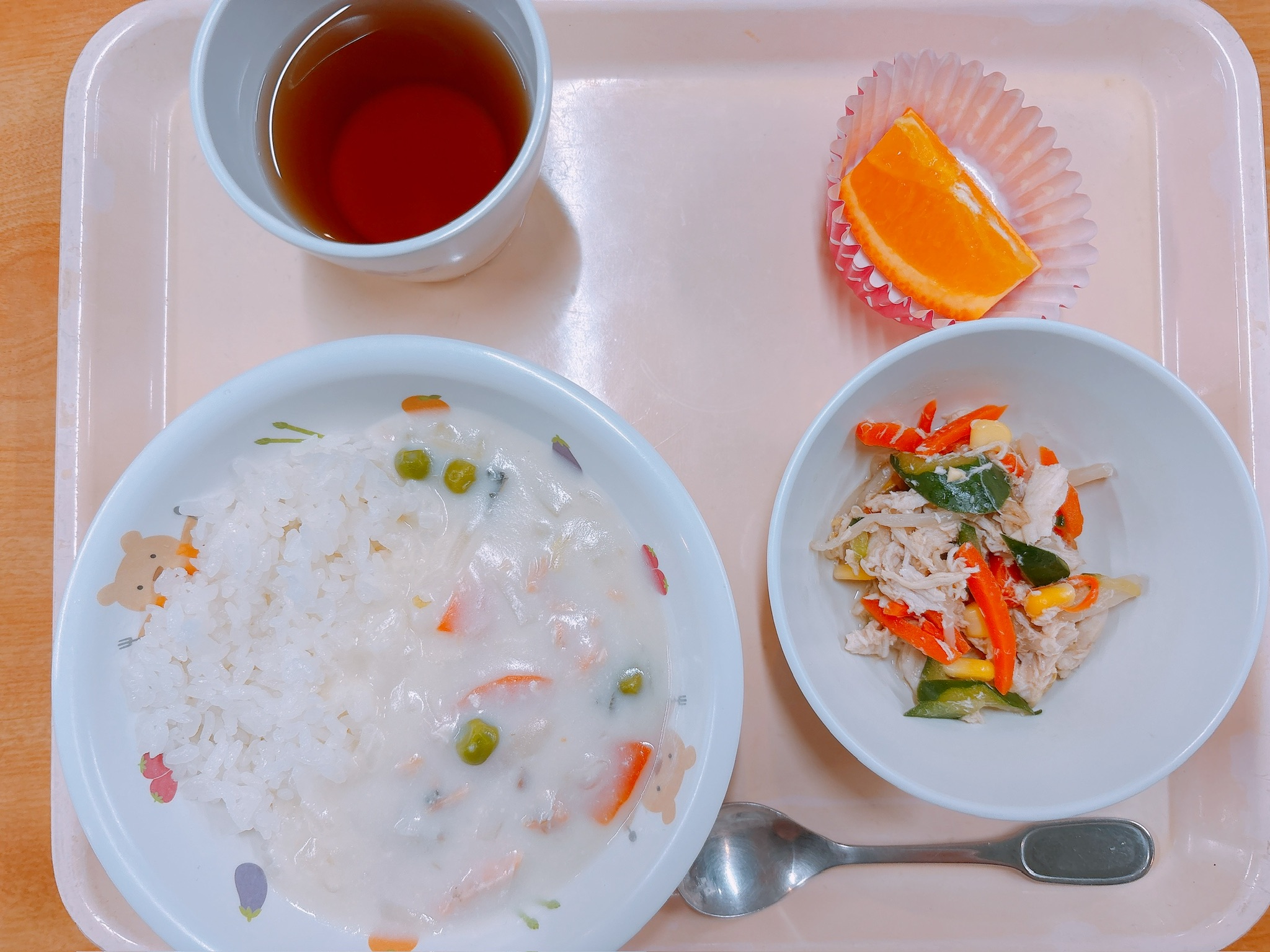 ご飯、鮭のクリームシチュー、蒸し鶏のサラダ、オレンジ