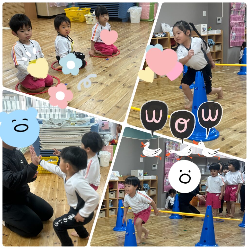 今日はうさぎ組さん、ぱんだ組さん、ぞう組さんは園内でコーディネーション運動教室がありました。