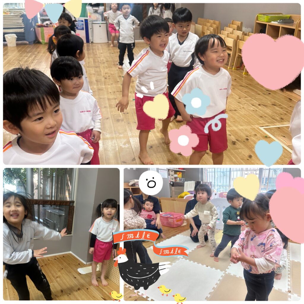 先生の真似をして上手に手を伸ばしたり、くるっと回ったり、にこにこ楽しく運動ができました。