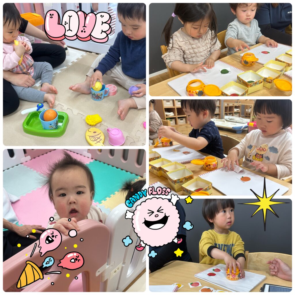 小さいお友達はおままごと遊びでコップにおもちゃをいれたり、つかんだりして楽しみました♪