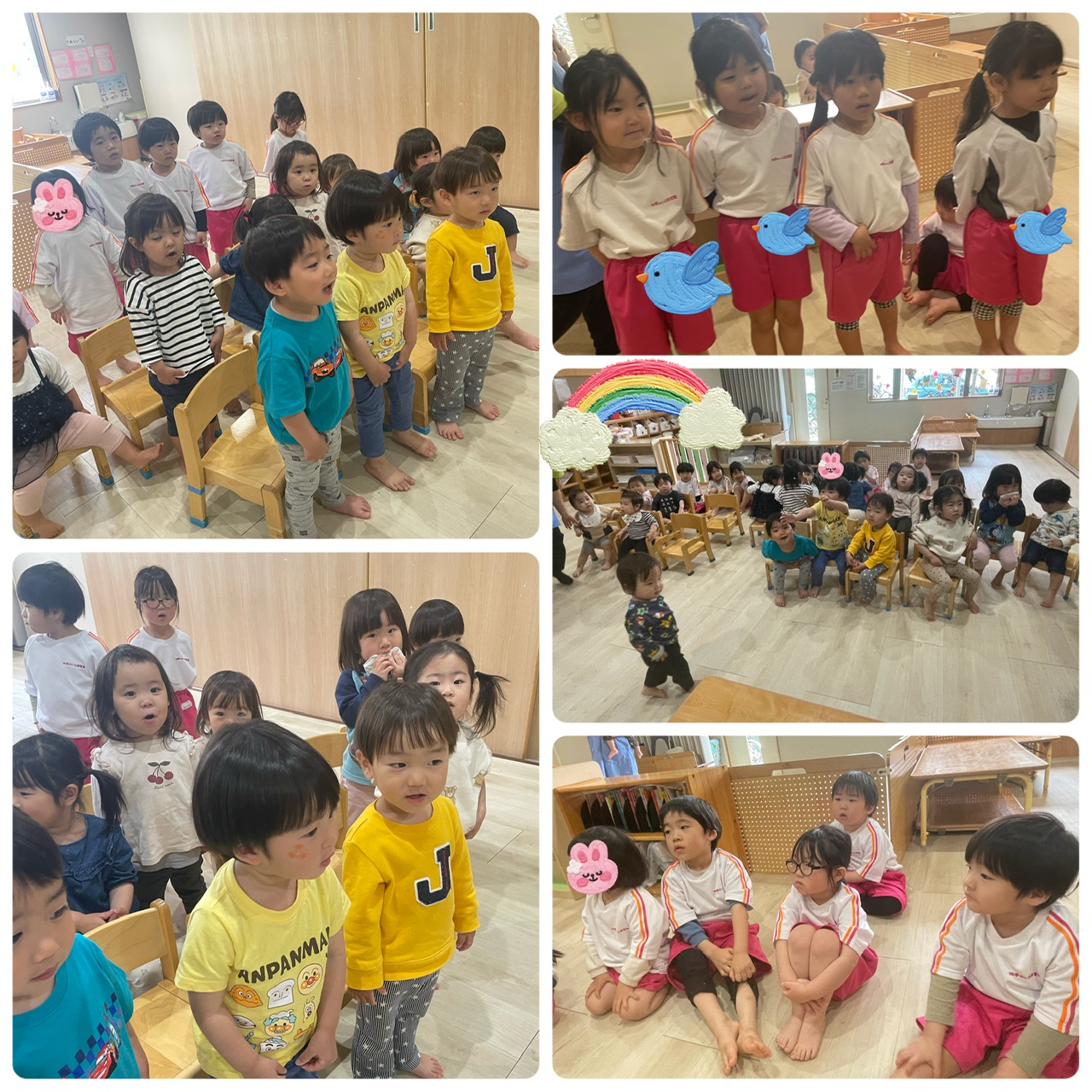 保育園で遊んだお友達は、未満児さんも以上児さんも一緒に朝の会をした後、子どもの日会がありました🎏こいのぼりについての話や紙芝居に興味津々の子どもたちでした✨✨