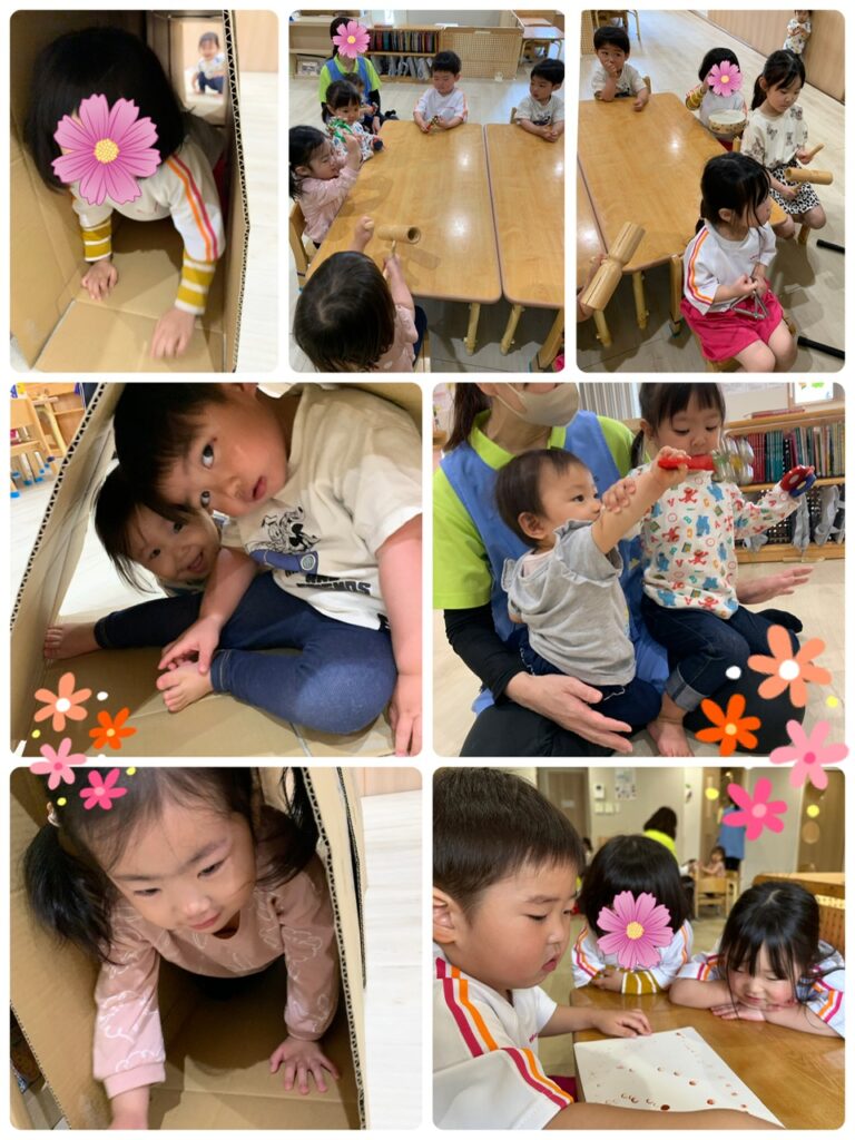 みんなで朝の会をした後、ダンボールで遊んだり、リズム遊びをしたりして楽しく過ごしました♬