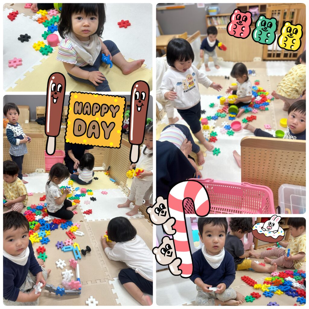 ブロック遊びではブロックを繋げたり、重ねてみたり、みんな自由な遊び方で見ているとこちらも楽しくなりますね🌷