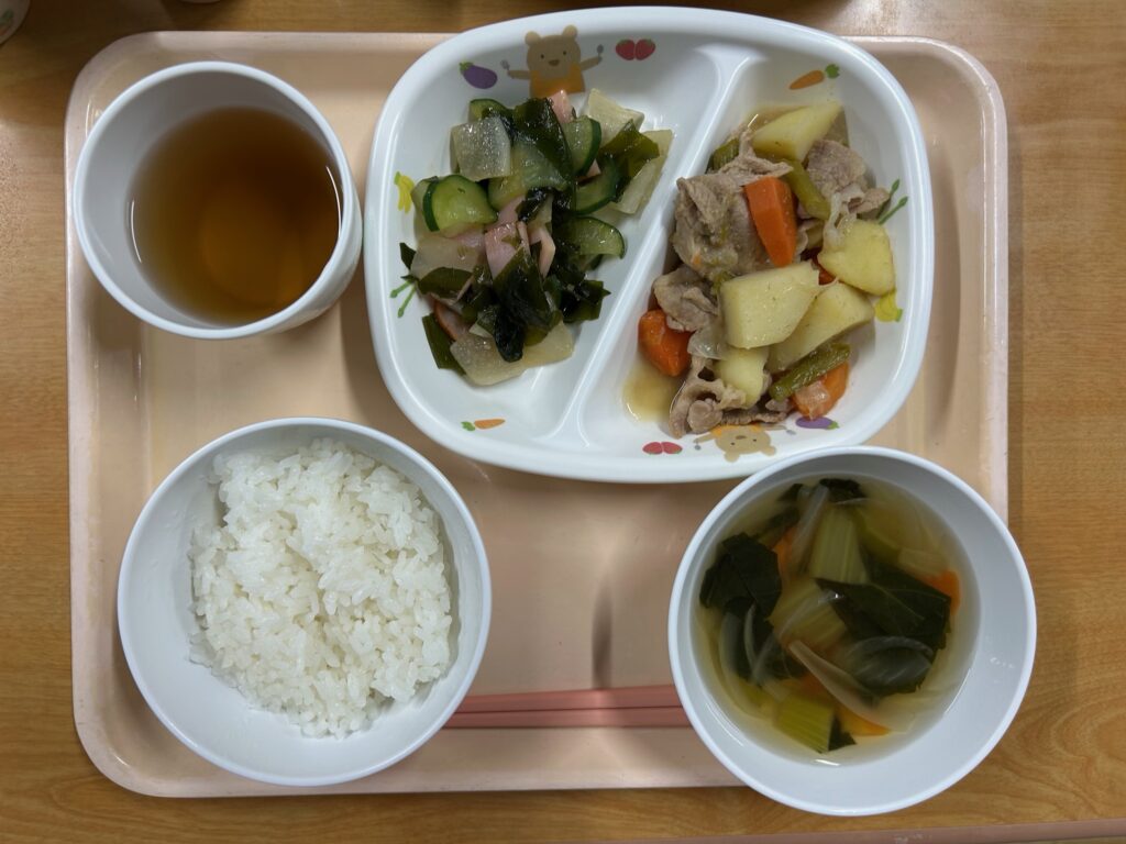 ご飯 洋風肉じゃが 大根サラダ チンゲン菜のスープ