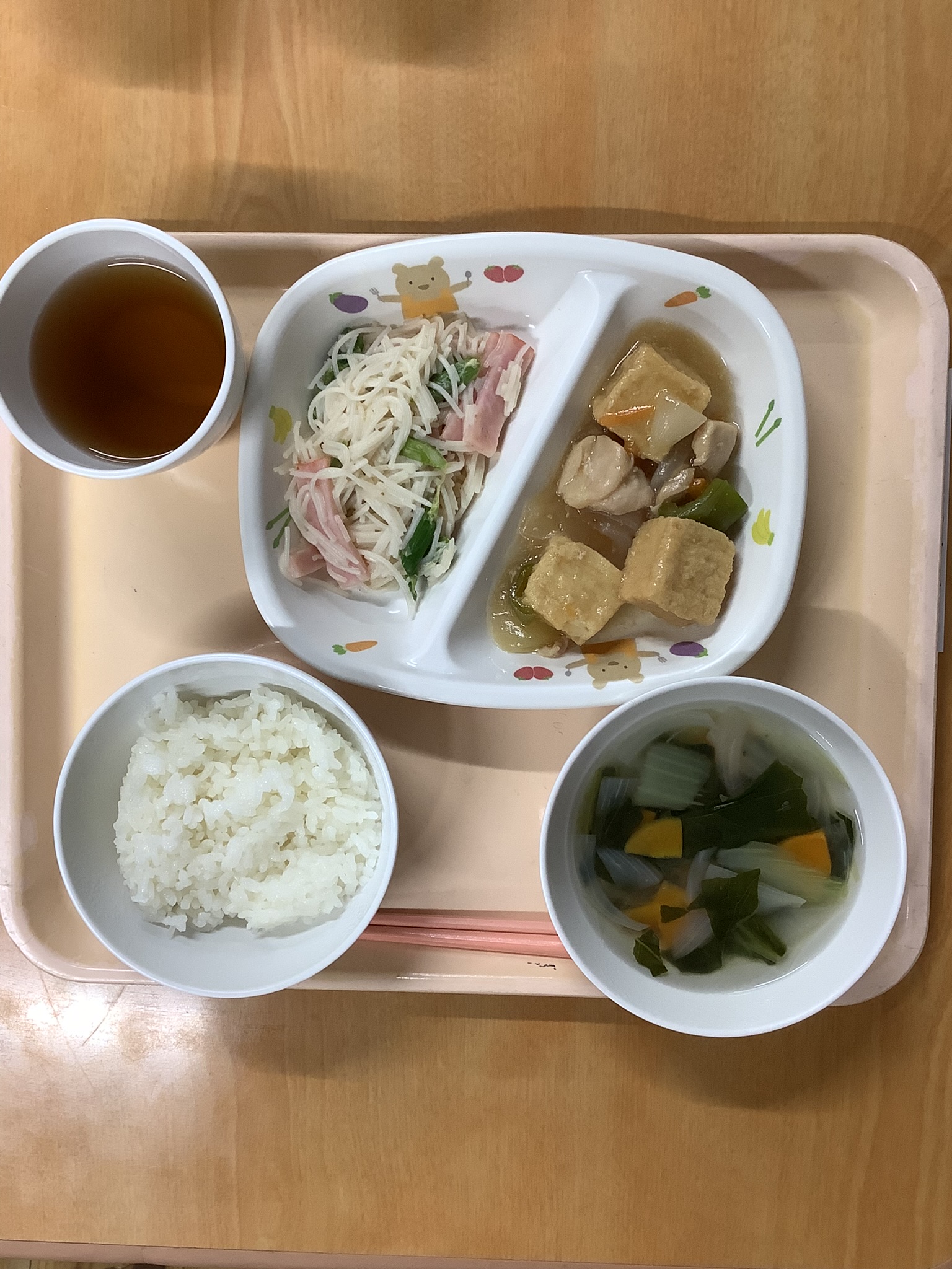 ご飯、鶏肉と厚揚げ豆腐の甘酢炒め、ビーフン中華サラダ、チンゲン菜のスープ