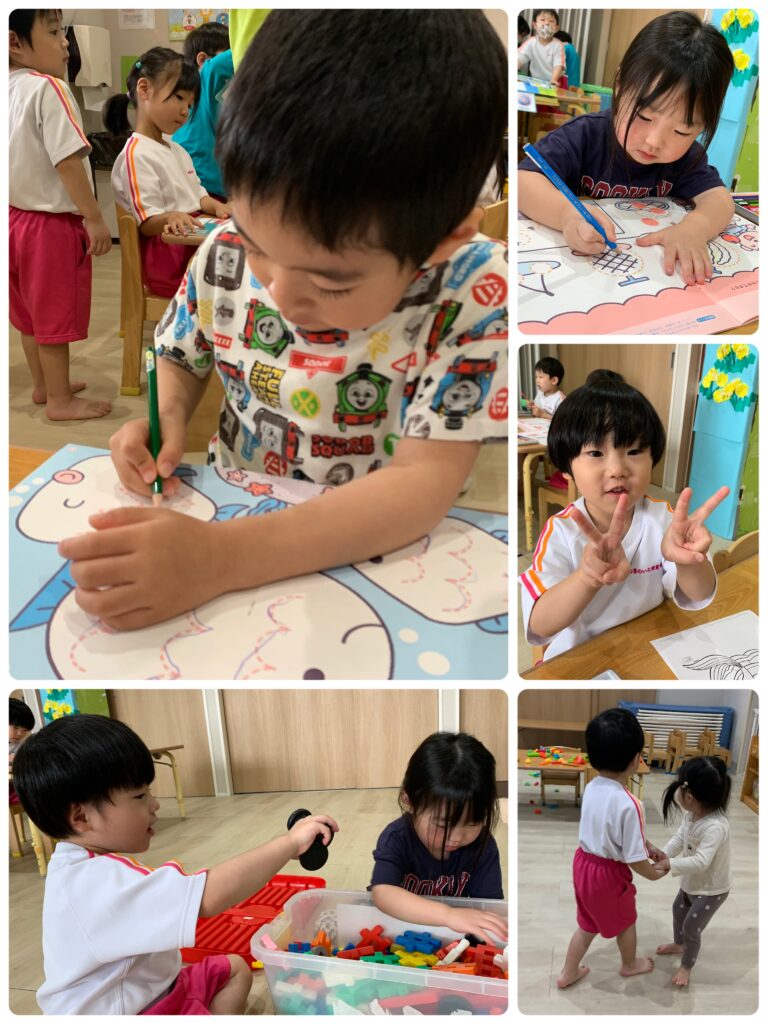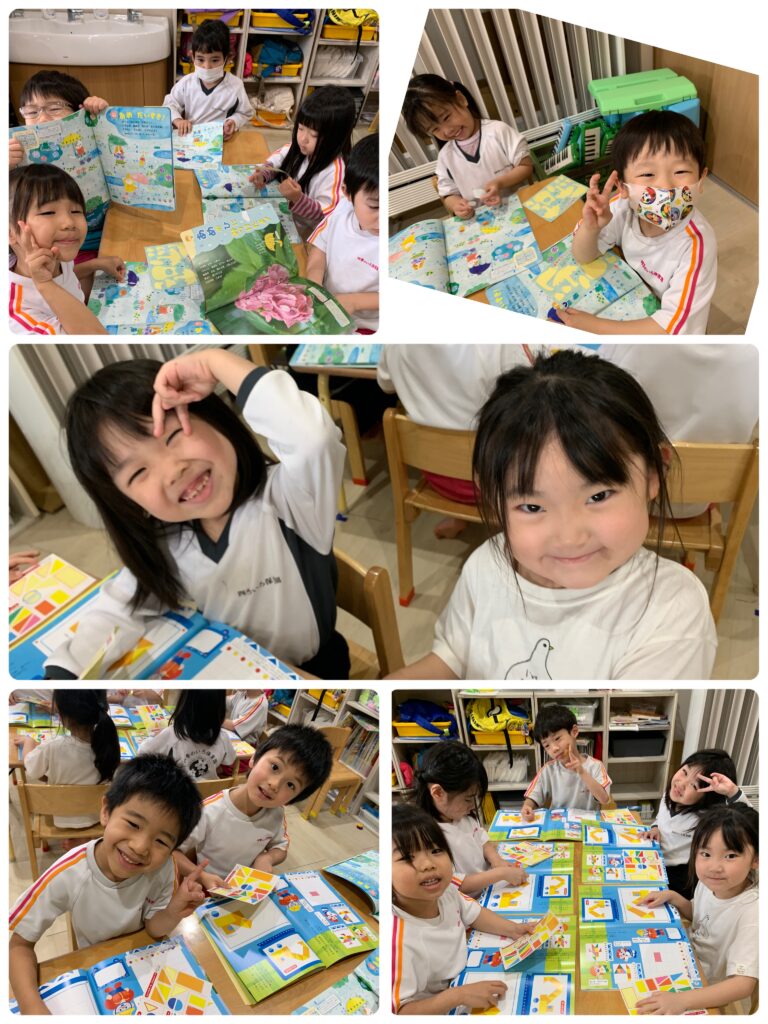 以上児さんは、ワークや製作をしました。みんな集中して取り組んでいましたよ。シール貼りも上手に出来ましたね。