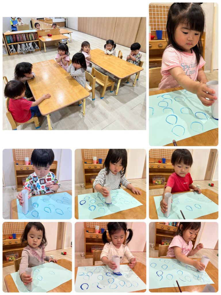 今日は、未満児さんは製作をしました。紫陽花や雨粒などをスタンプしました。みんな上手にスタンプ出来ていましたよ!