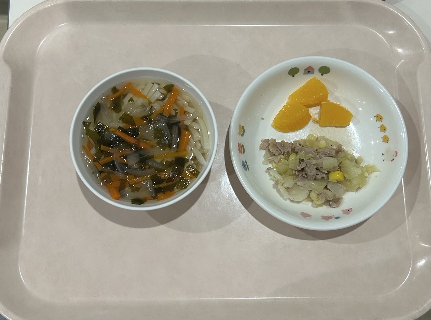 わかめうどん、豚しゃぶサラダ、オレンジ