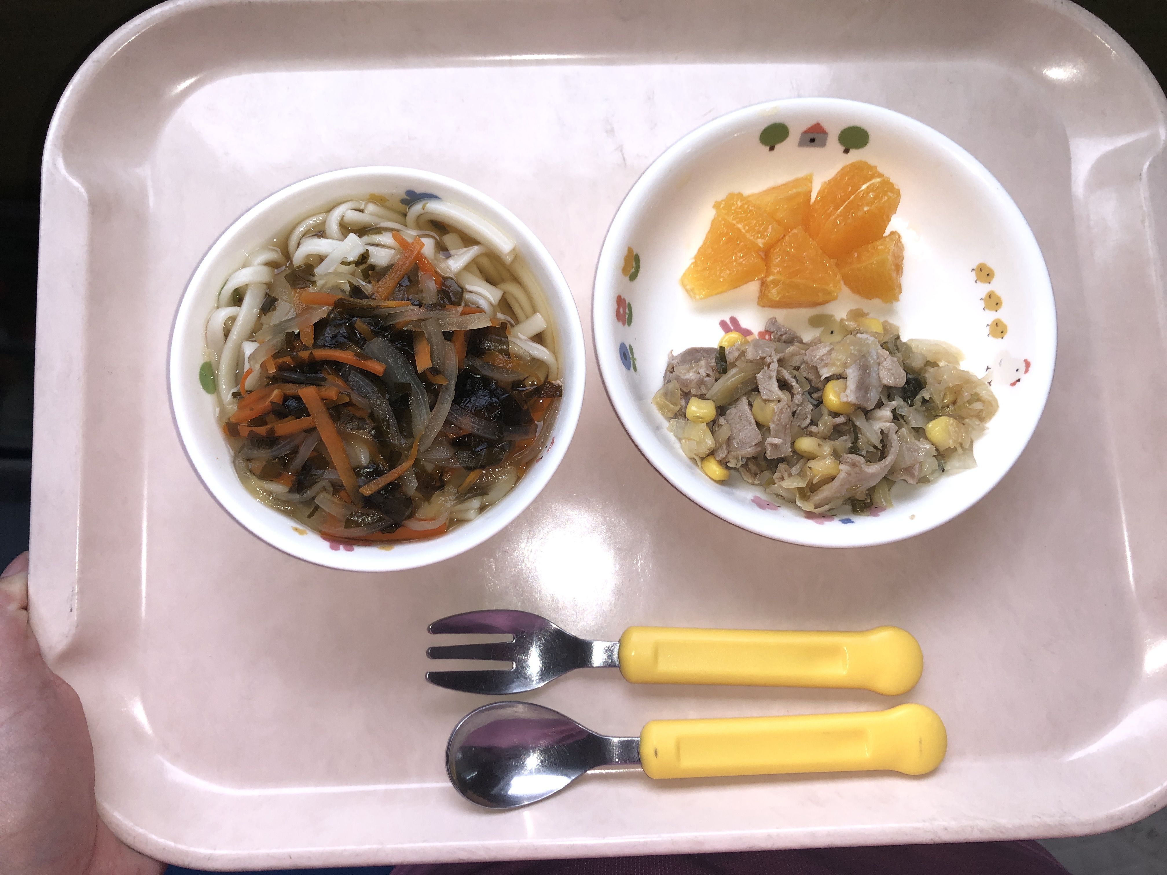 わかめうどん・豚しゃぶサラダ・オレンジ
