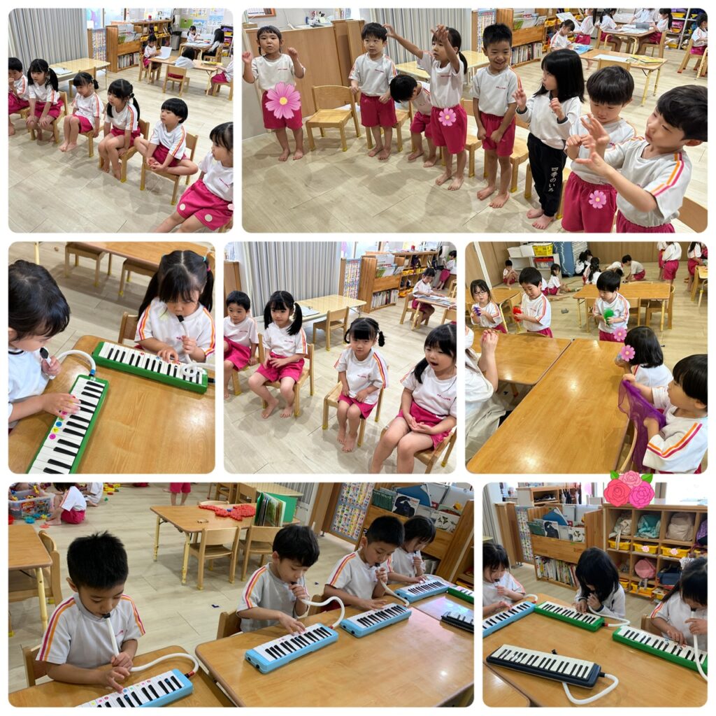 音楽教室では、鍵盤ハーモニカを集中して吹いていましたよ!!