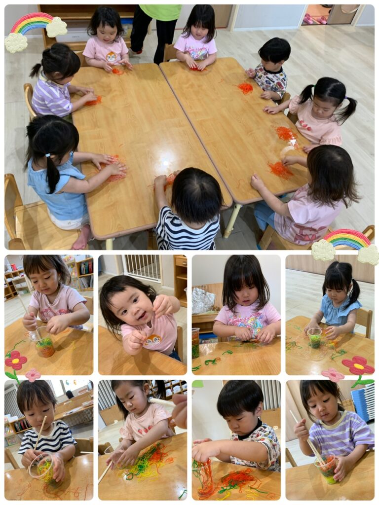 つき組さんは、春雨を使って感触遊びをしました!!実際の春雨に興味津々の子どもたち。色がついた春雨を見ると大喜びでみんな前のめりになって触れていましたよ♬
