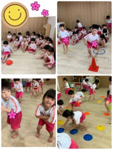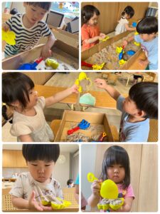 今日は未満児さんは室内で砂遊び、以上児さんはコーディネーションをしました。