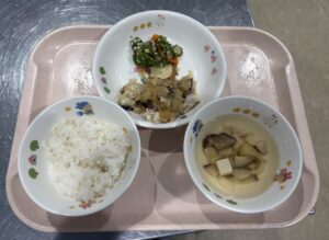 麦ごはん、すまし汁、サバと玉ねぎのみそ煮、おくらのおかか和え