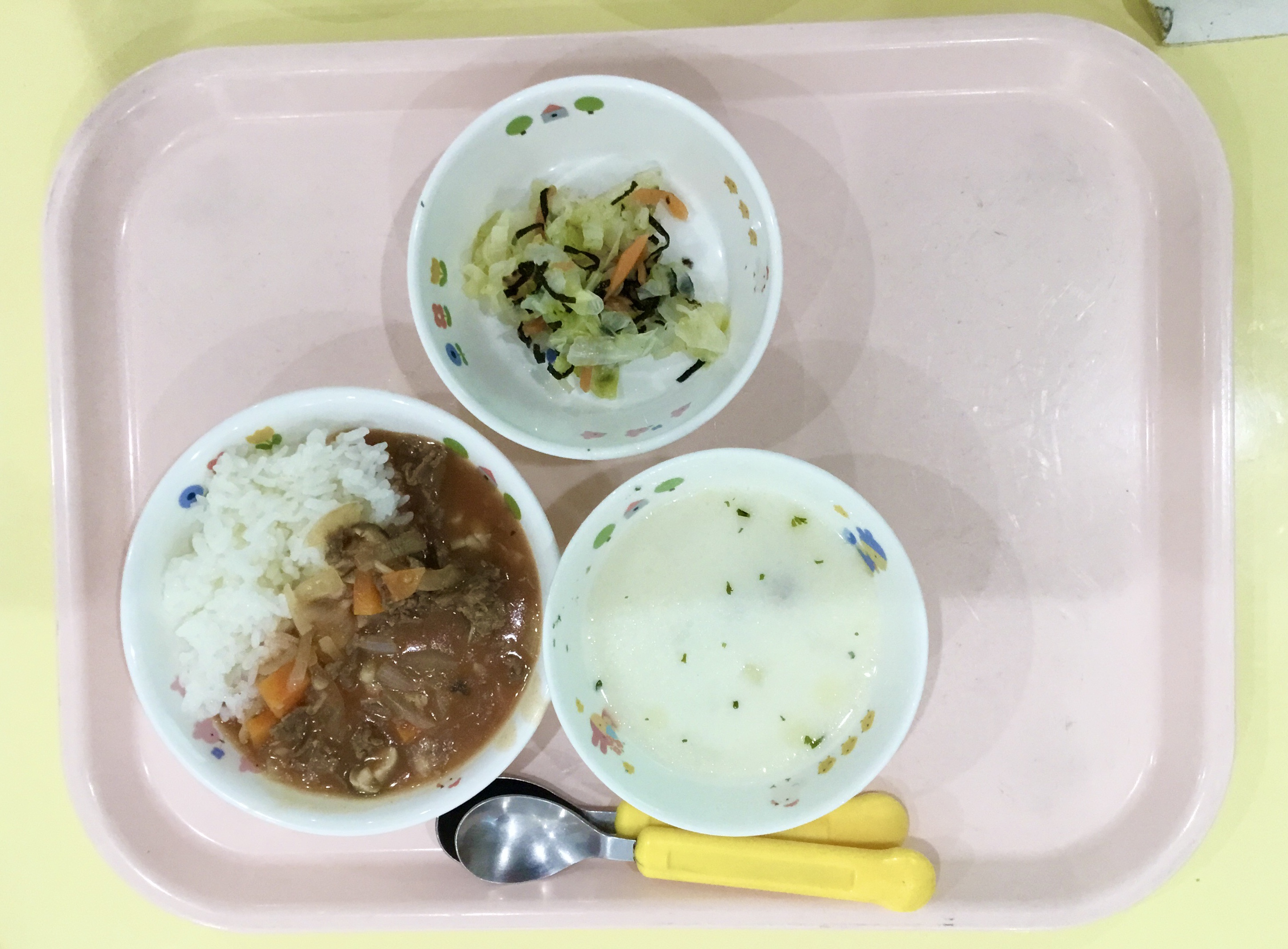 ハヤシライス、豆乳ポテトスープ、キャベツの塩磯あえ