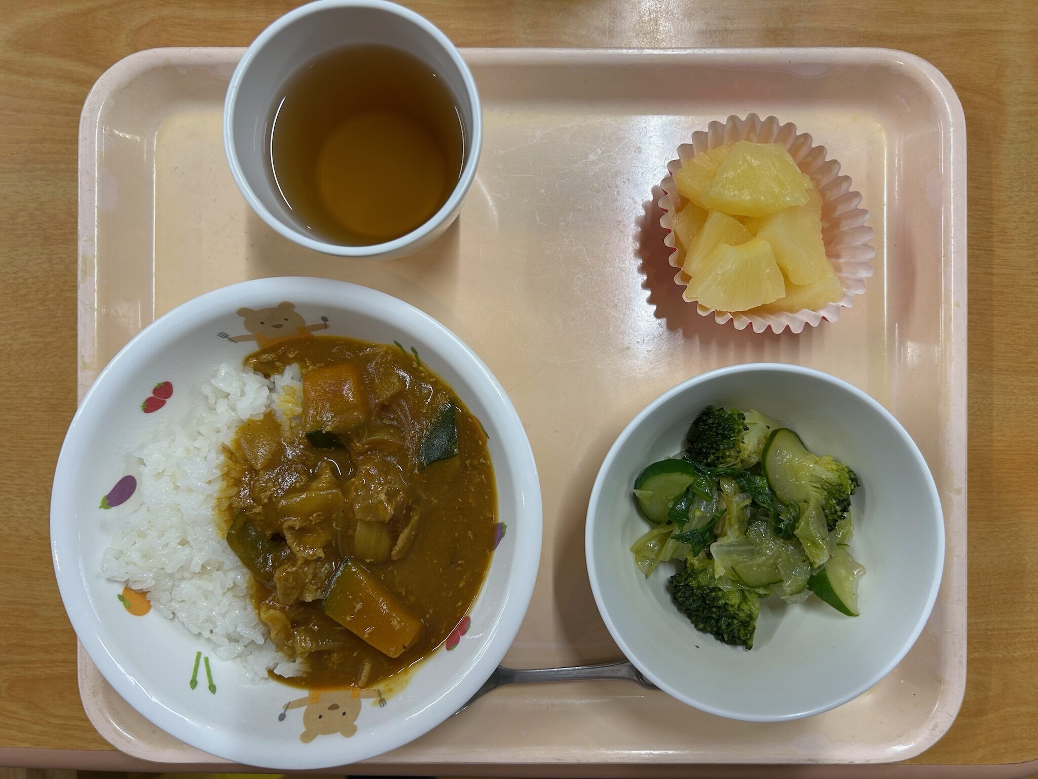 ご飯、夏野菜カレー、グリーンサラダ、パイン缶詰