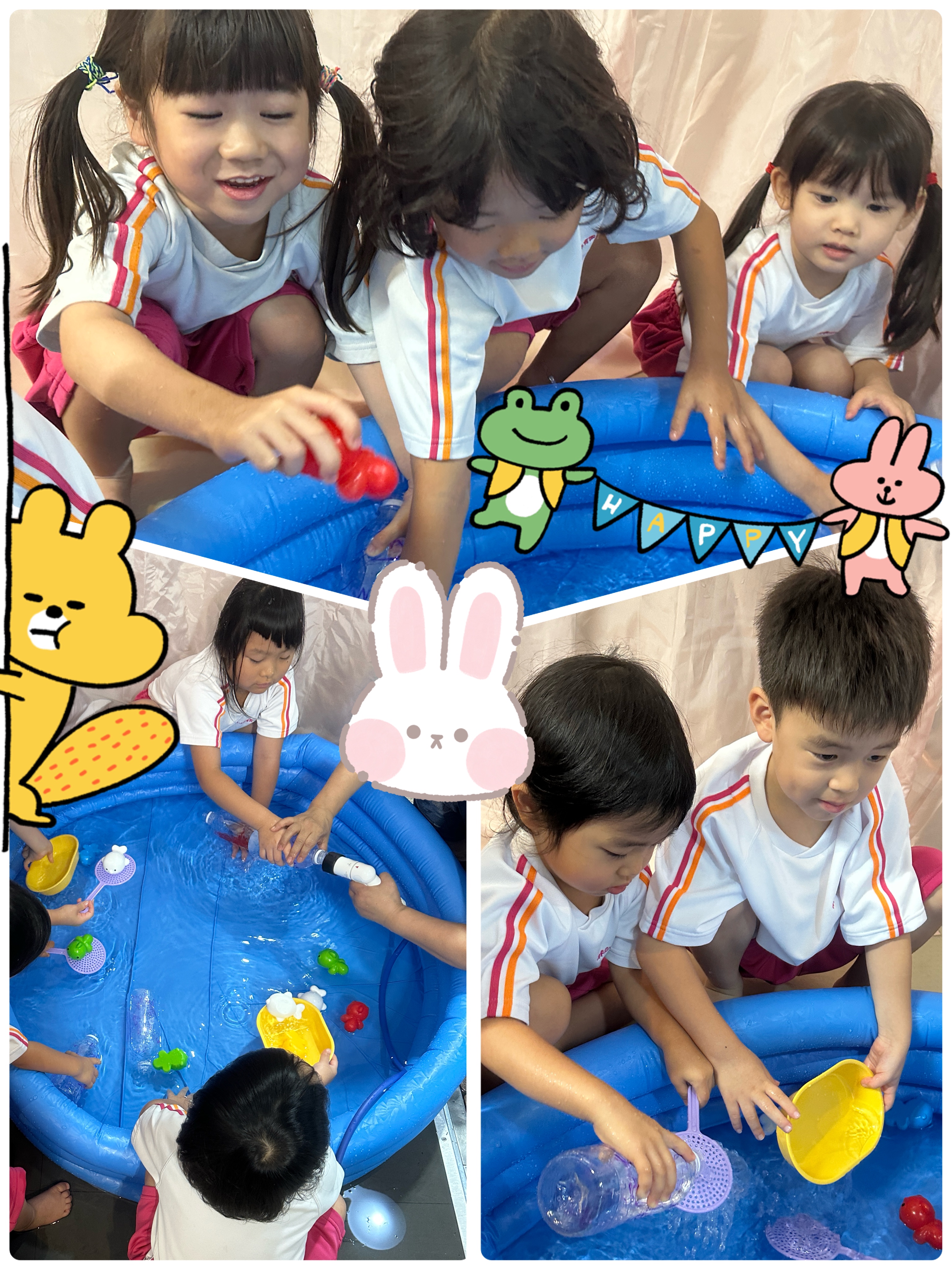 うさぎ組、ぱんだ組、ぞう組さんは水遊びをしました。