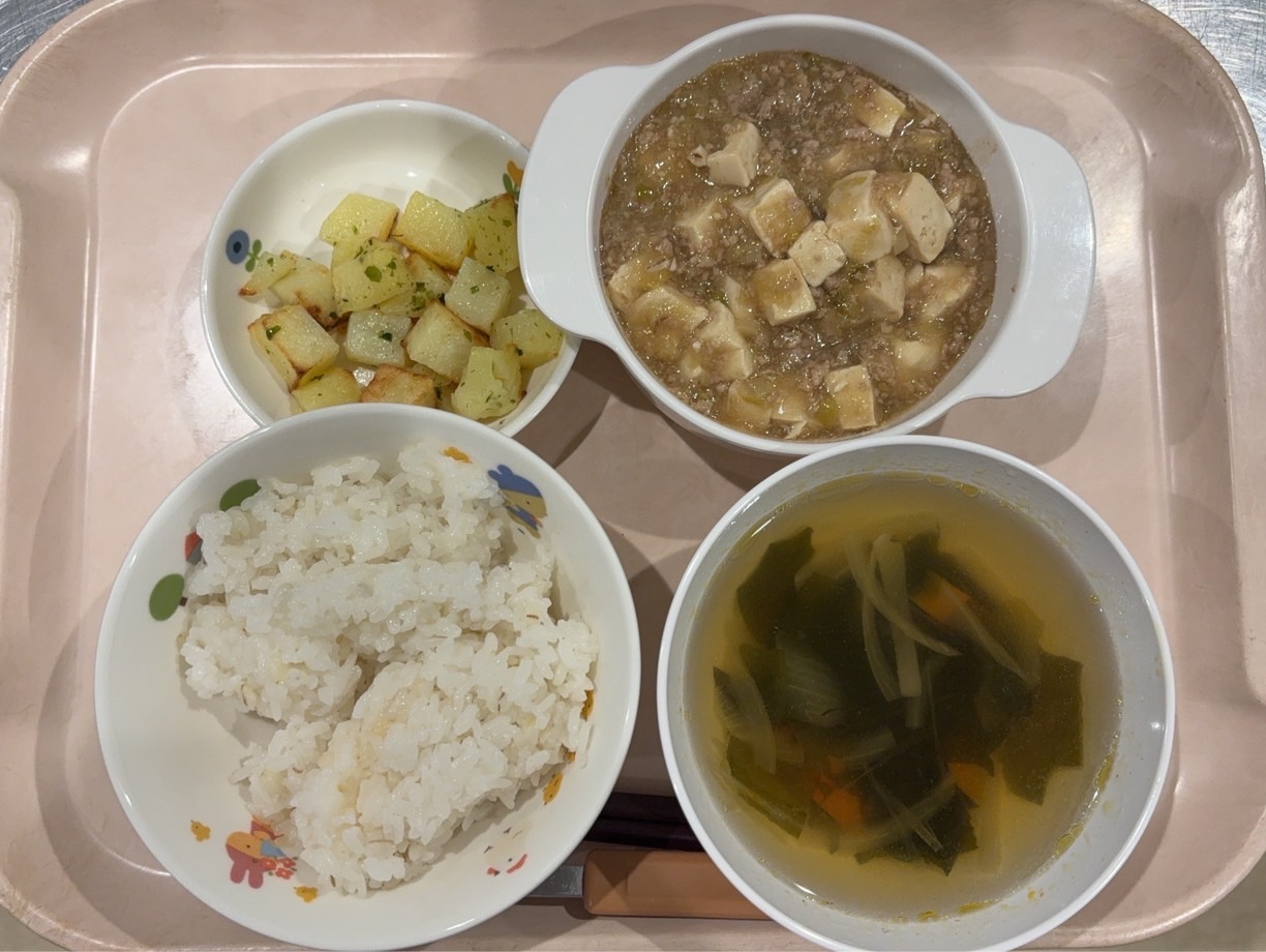 麦ごはん、わかめスープ、マーボー豆腐、ベイクドじゃが