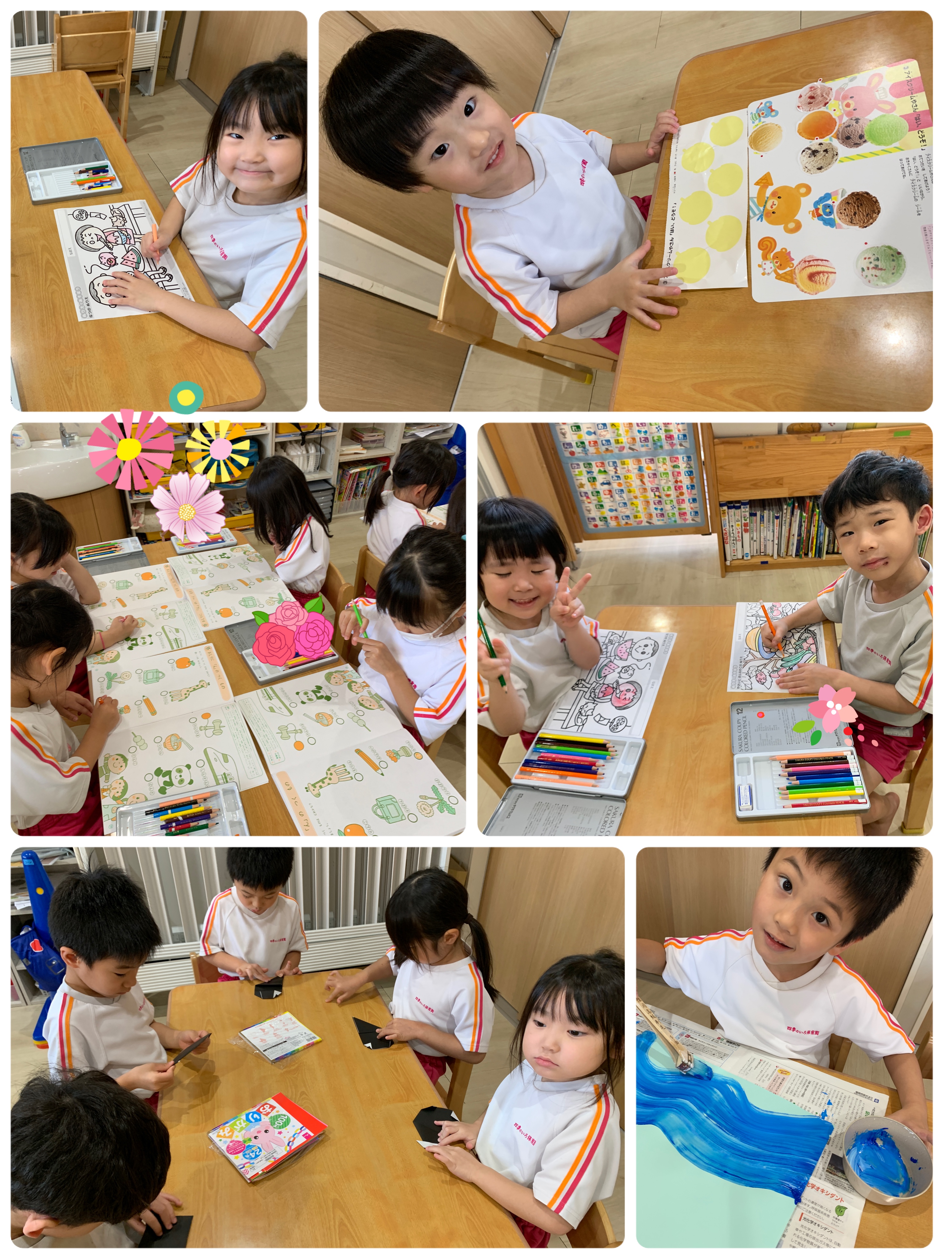 以上児さんは製作や塗り絵、ワークなど、いろんな遊びを楽しみましたよ♪( ´▽`)