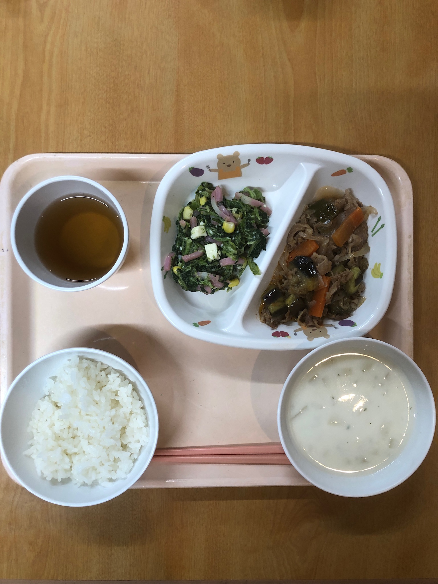ご飯、牛肉とナスのケチャップ炒め、ポパイサラダ、ポタージュスープ