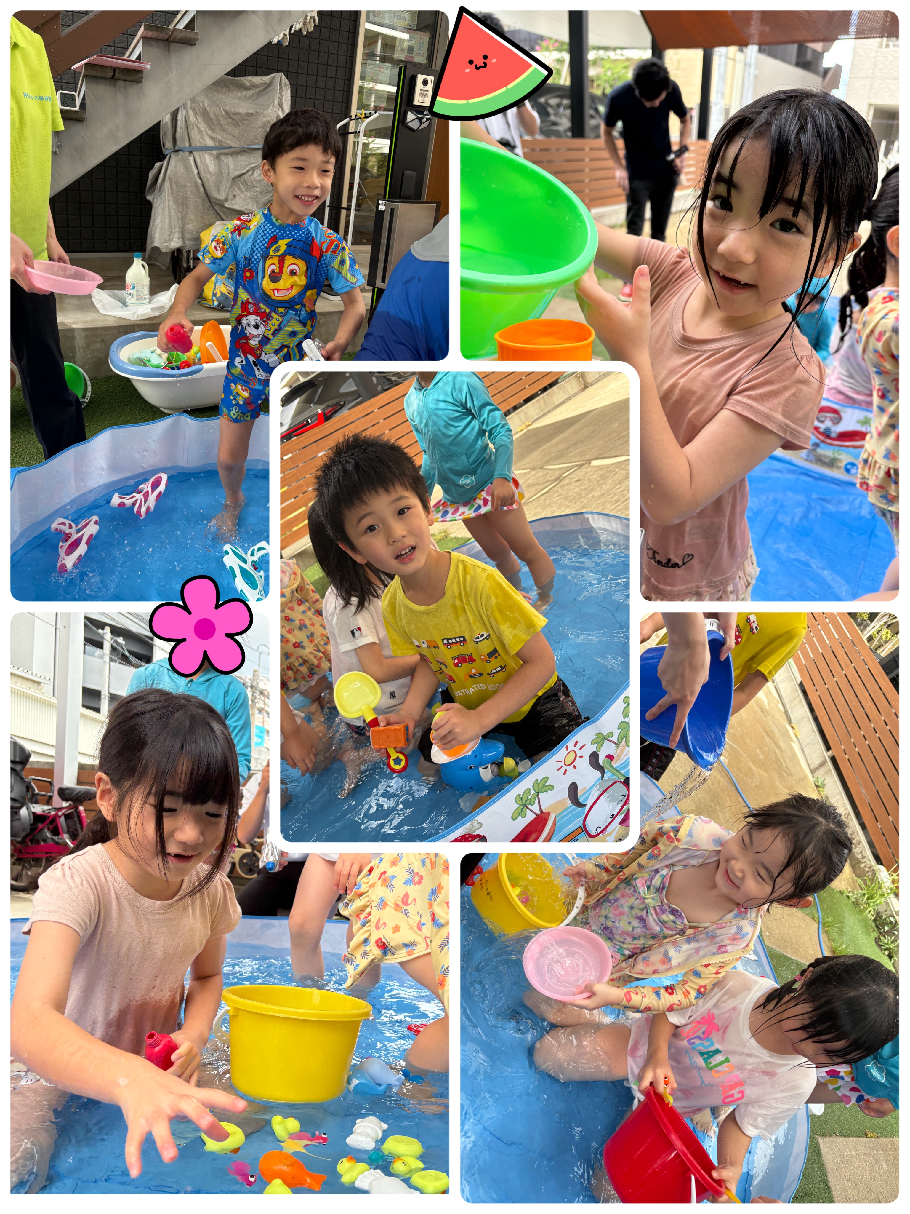水遊びでは、普段とは違うおもちゃで思いっきり水遊びを楽しみました🌈その後はお部屋に入り、スライム作りをしました✨