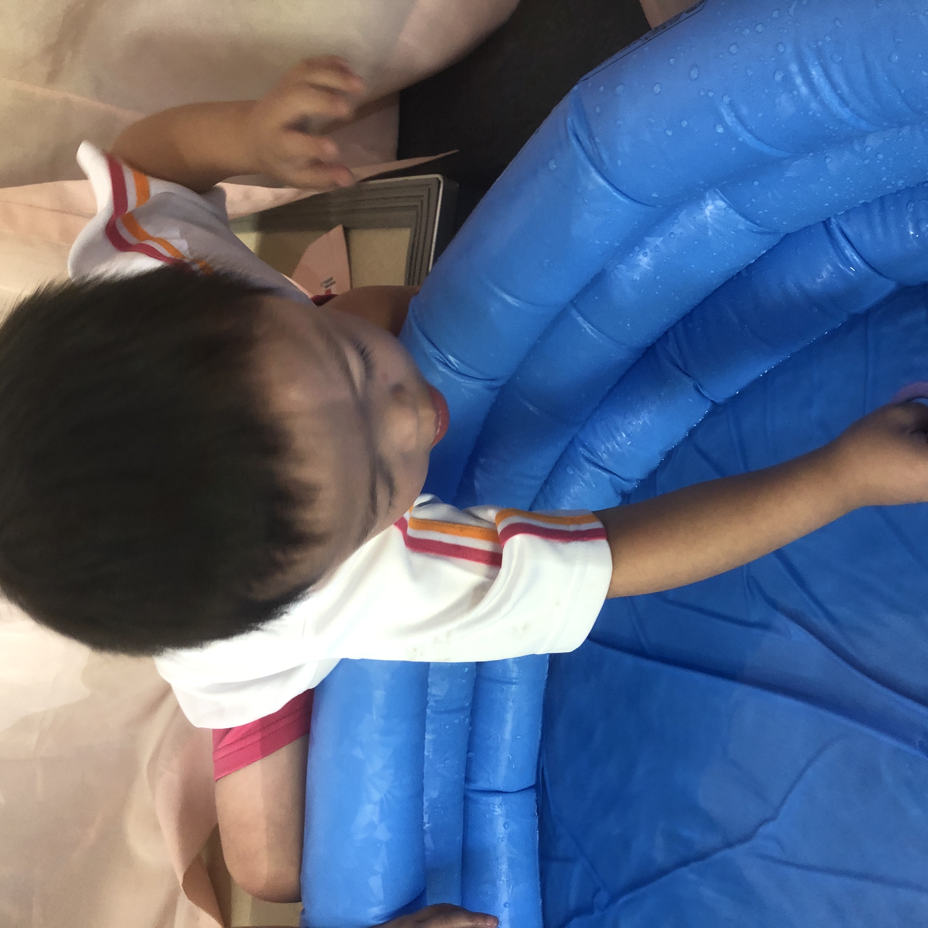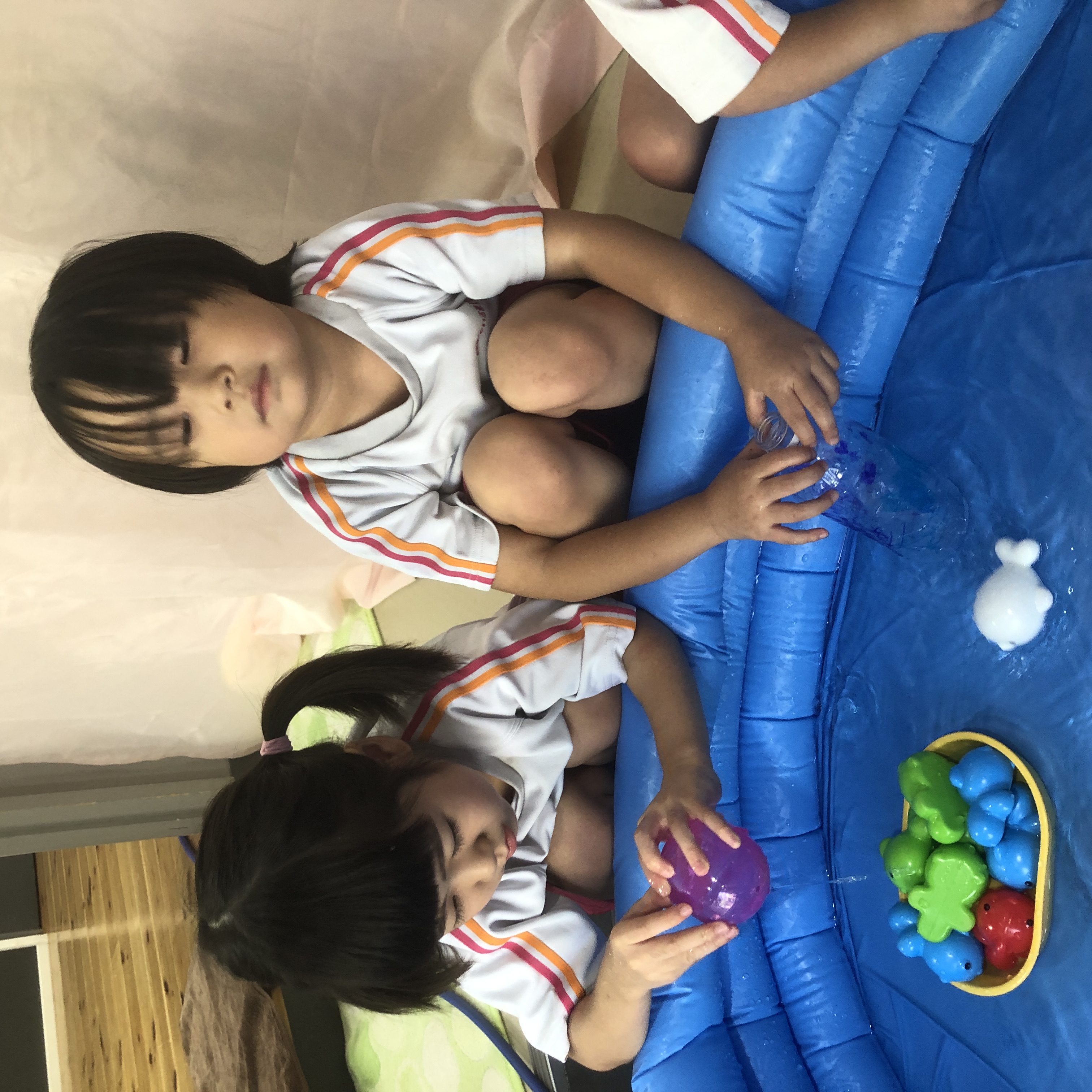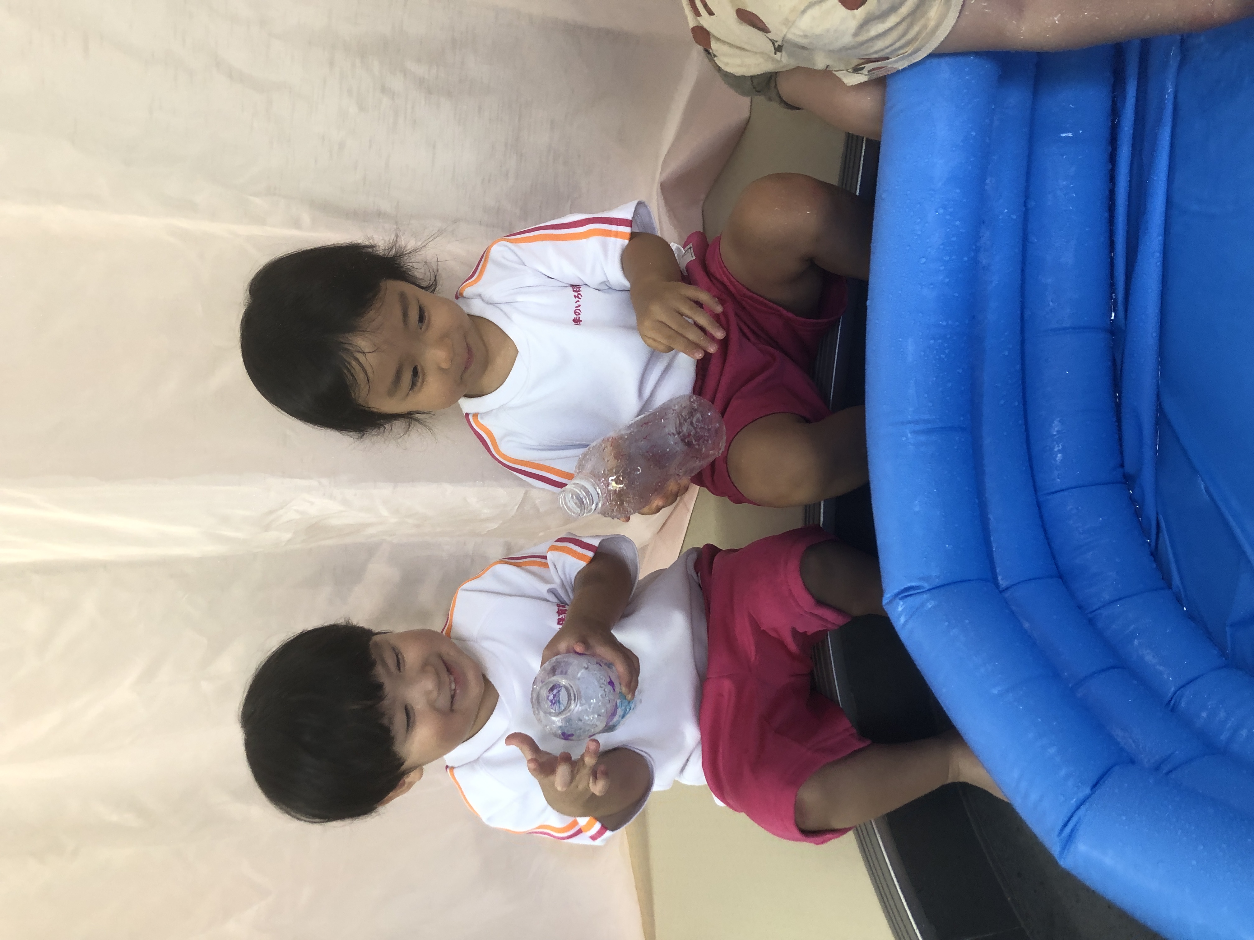 向かい側から、プールを揺らして波をつくると、「うみ」の歌を歌いながら遊んでいましたよ🌊