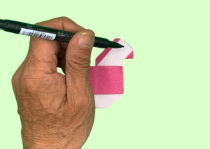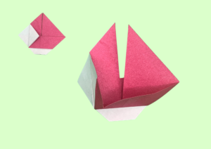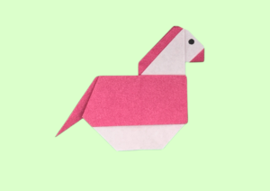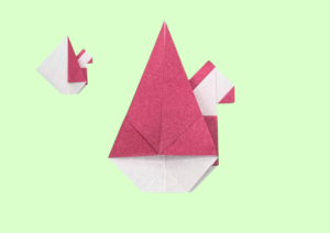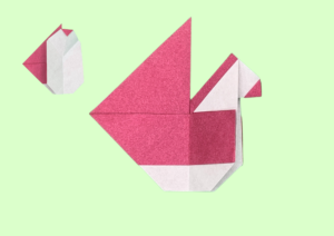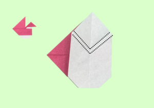 ⑩ ⑨で開いた上の部分を画像のように4ミリ程度折り込み、折り目に沿って折りたたみます。画像のようにお馬さんの顔が出来上がりました。